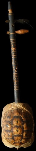 Les 5 cordes sont tendues sur un arc de bois au moyen de chevilles. La caisse de résonance en bois gravé est recouverte d’une peau tendue.