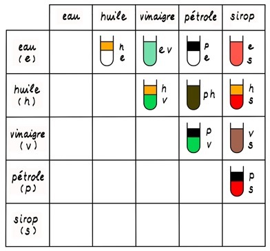 L'huile (hydrophobe) ne se mélange pas avec le vinaigre (hydrophile). Le sel se dissout dans le vinaigre mais pas dans l'huile.