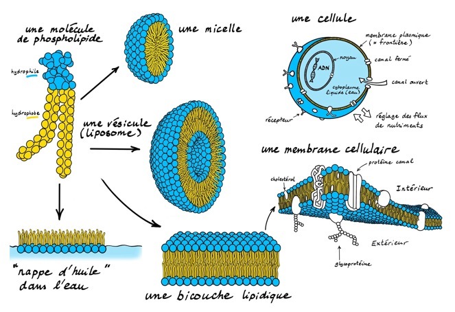Les êtres vivants sont constitués de cellules qui sont isolées de l'extérieur par une membrane cellulaire formée de 2 couches de phospholipides (une sorte de «savon» ). Cette frontière est plus ou moins perméable.