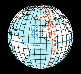 La longitude (méridien) est plus difficile à obtenir. Il a fallu attendre lʼinvention dʼhorloges très précises (chronomètre de John Harrison, 1760) pour y parvenir. En effet il faut comparer lʼheure locale avec l'heure de Greenwich (UTC). La différence de temps, convertie en degrés donne la longitude : 1 heure = 15°.