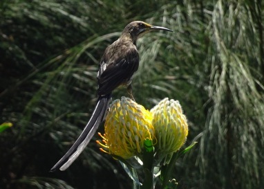 Le promérops du Cap (Promerops cafer) a un régime nectarivore: il se nourrit du nectar des fleurs (ici des proteas) qu’il aspire avec son long bec incurvé.