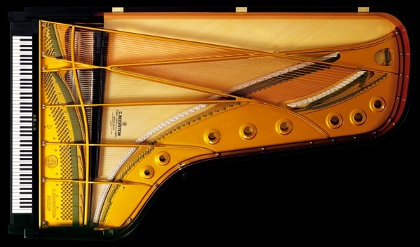 Un piano Bechstein D280 sans son couvercle est vu depuis dessus.
