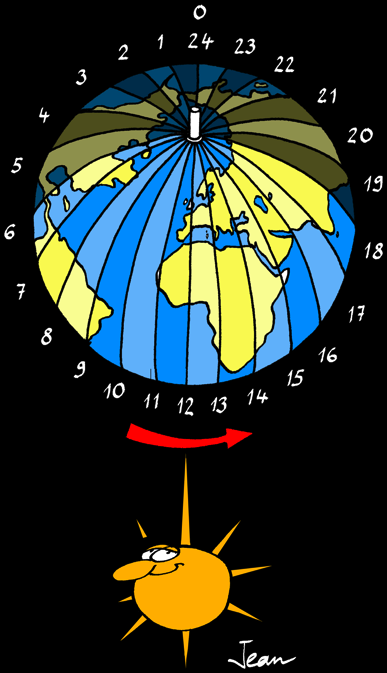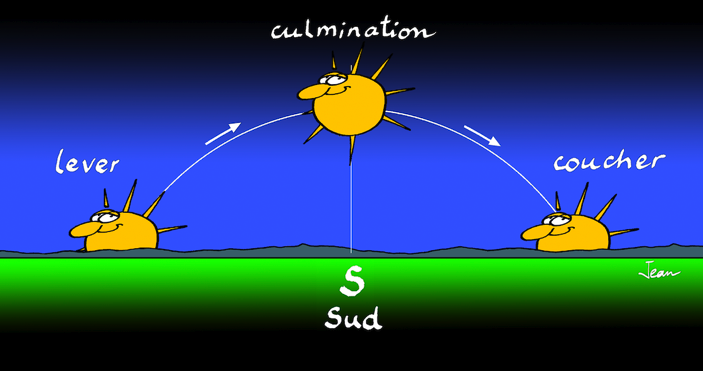 On sait bien que cette «course du Soleil» est une illusion produite par la rotation de la Terre. A chaque instant il y a un méridien différent qui se retrouve face au Soleil: pour ce méridien il est midi.